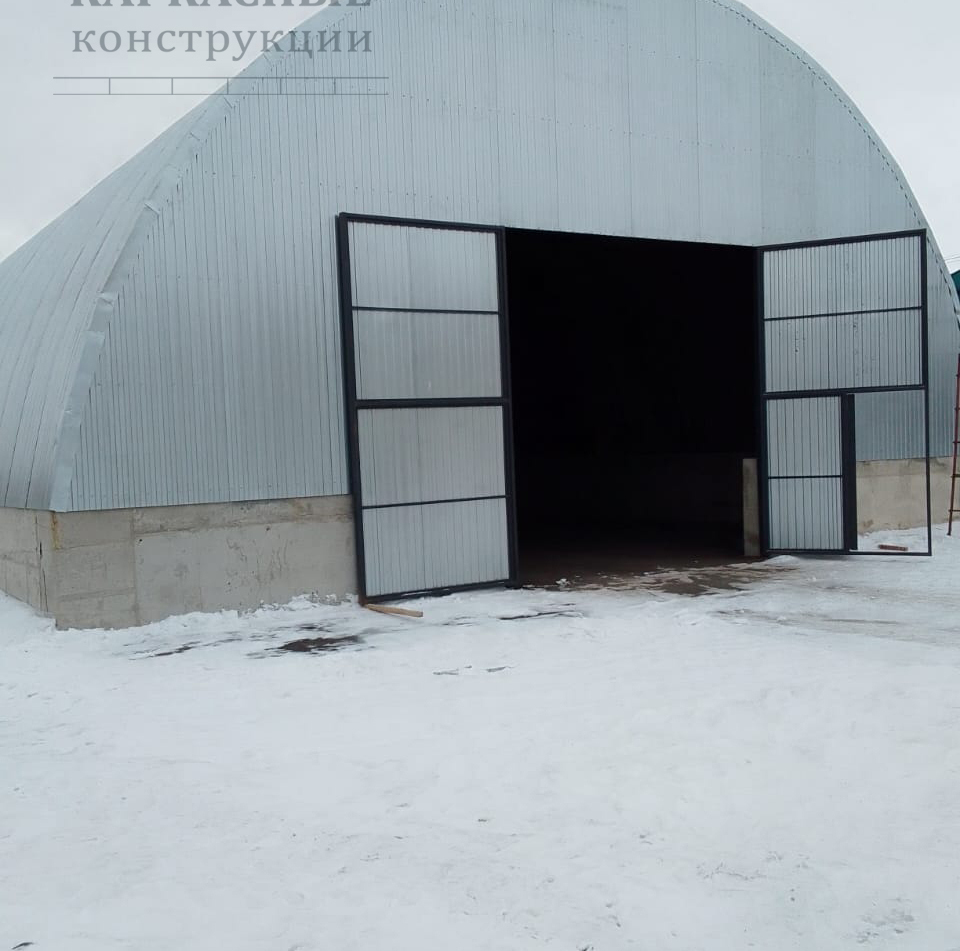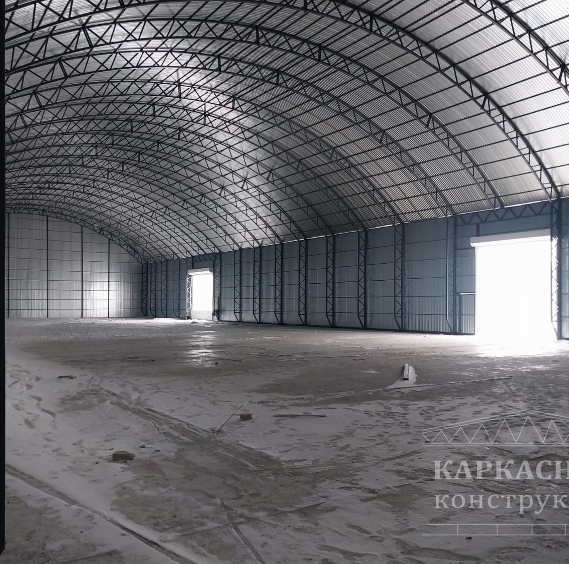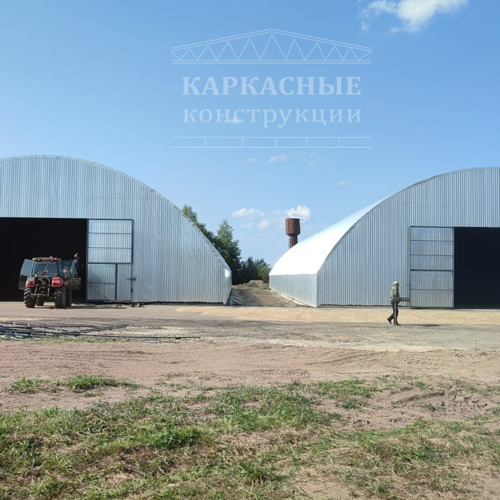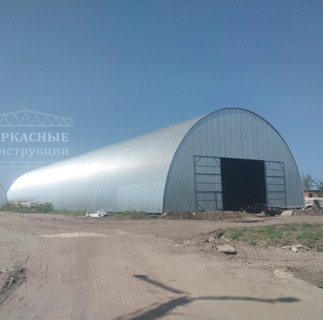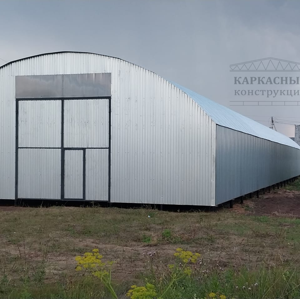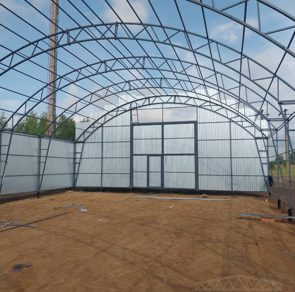Ширина пролёта: от 10 до 30 м.Каркас ангара из профильной трубы с вертикальной сеной и арочный крышей.