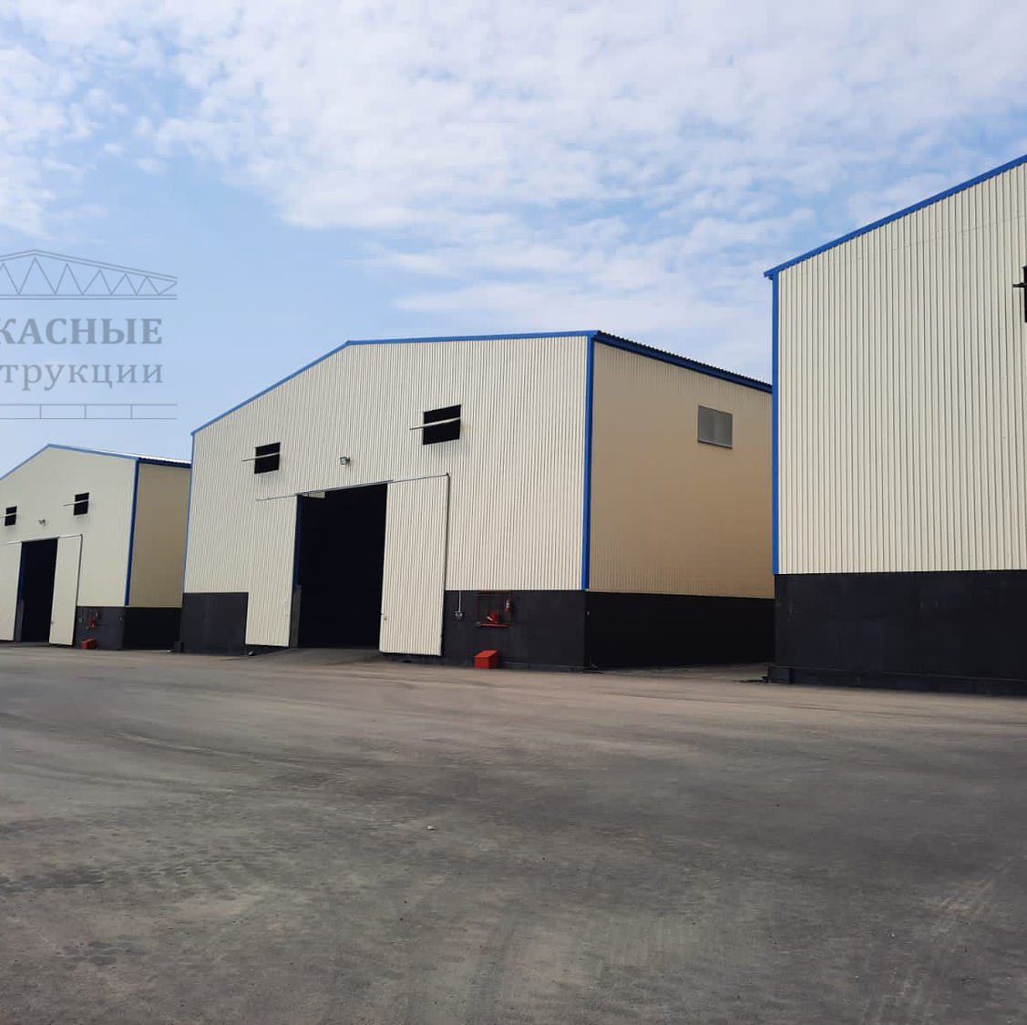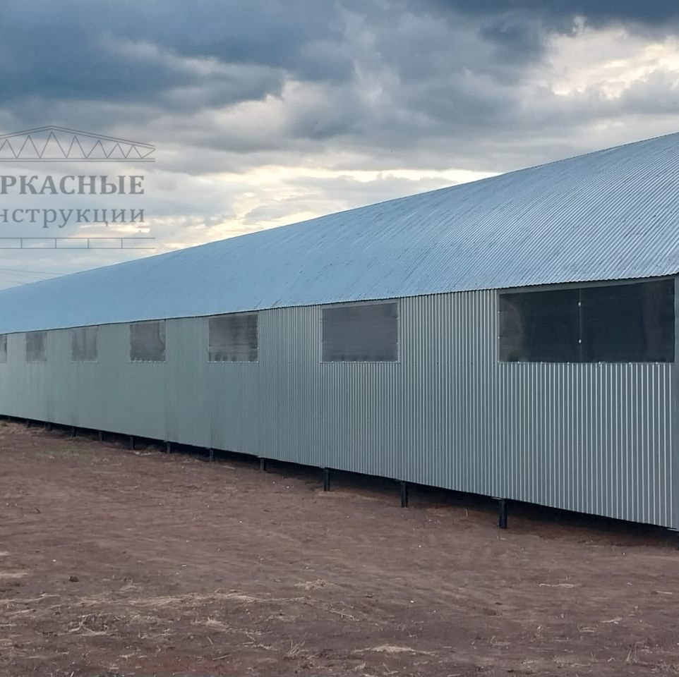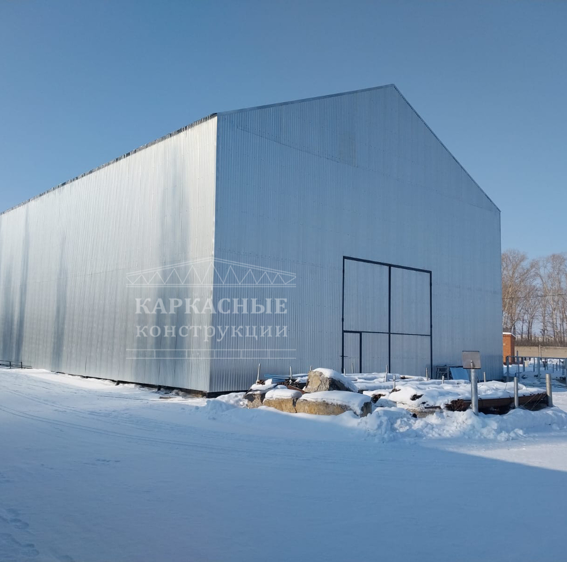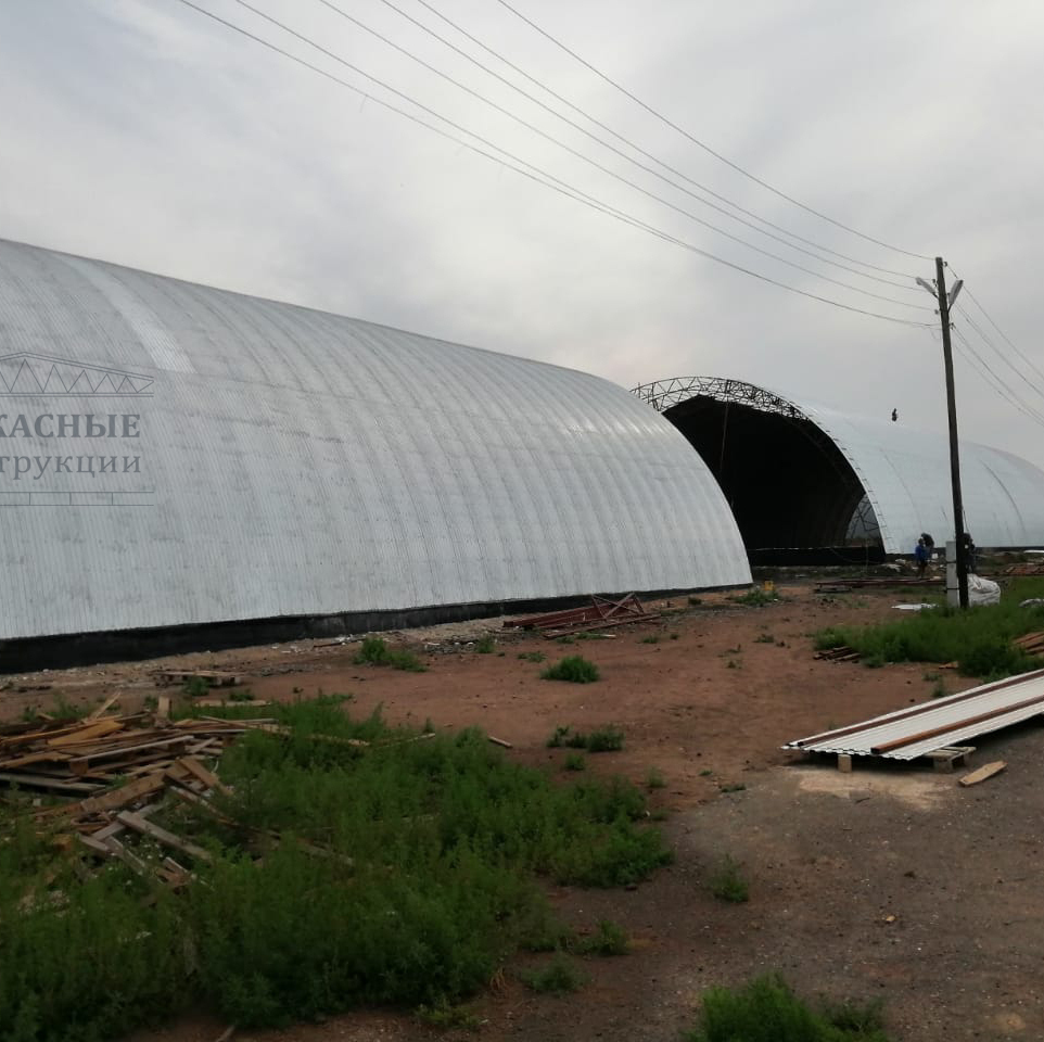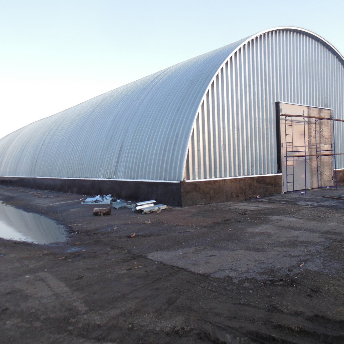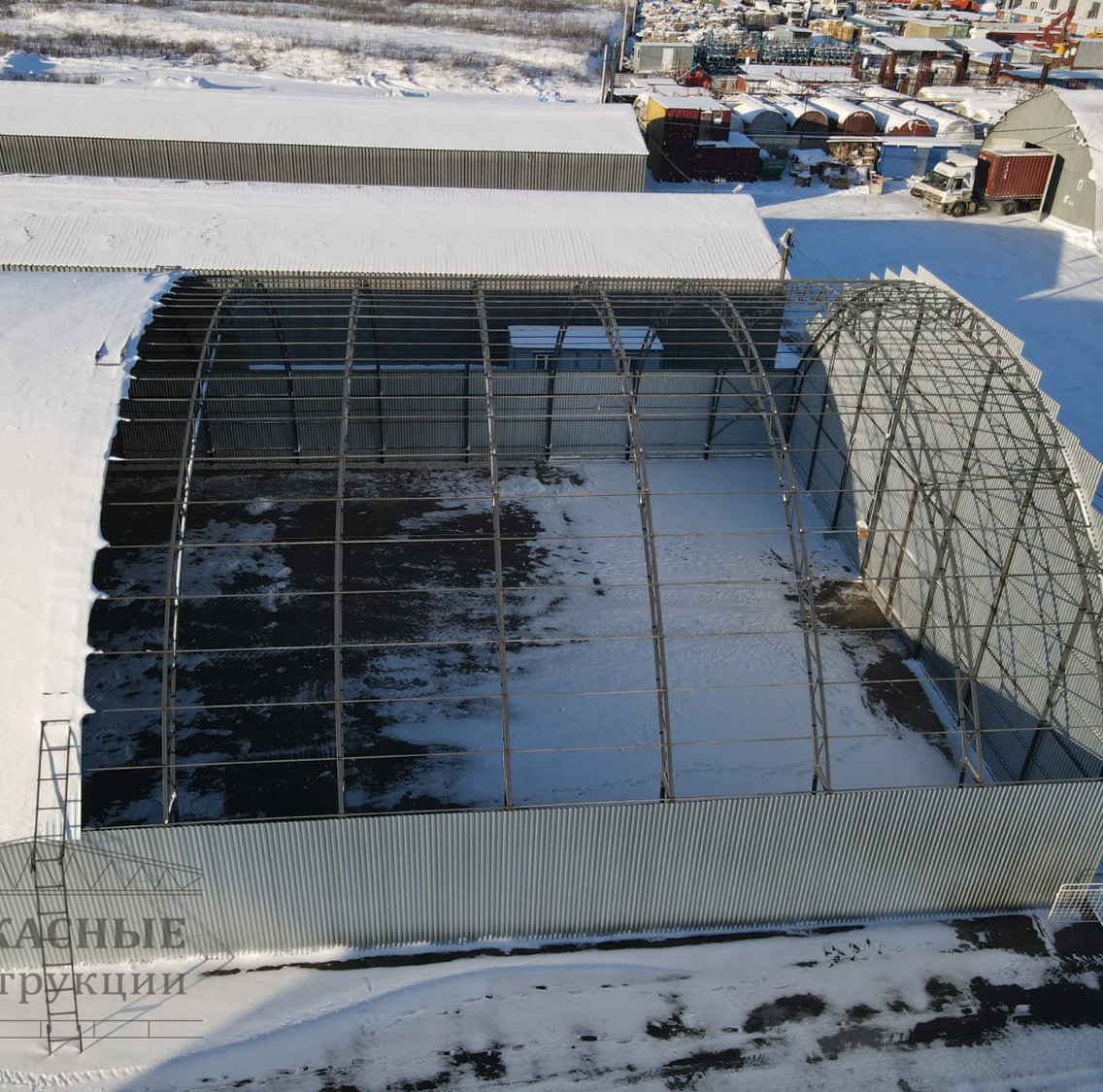 Ширина пролёта: от 10 до 30 м.Каркас ангара из профильной трубы с вертикальной сеной и арочный крышей.
